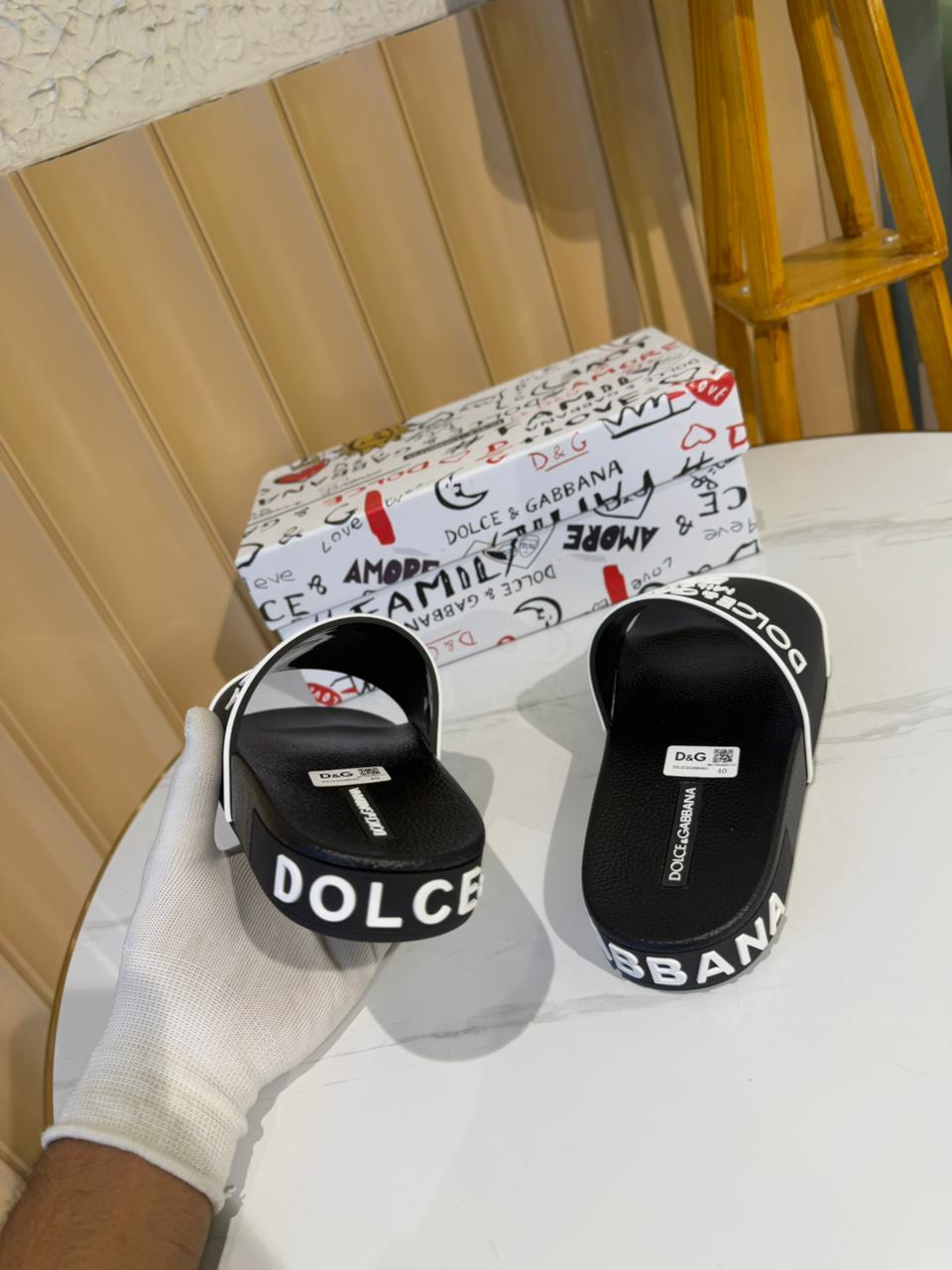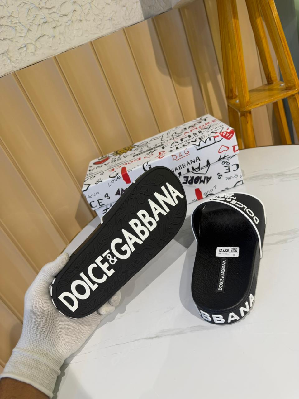 The open-toe silhouette and breathable construction enhance comfort, while the iconic Dolce & Gabbana branding adds a high-fashion edge to a relaxed essential.
