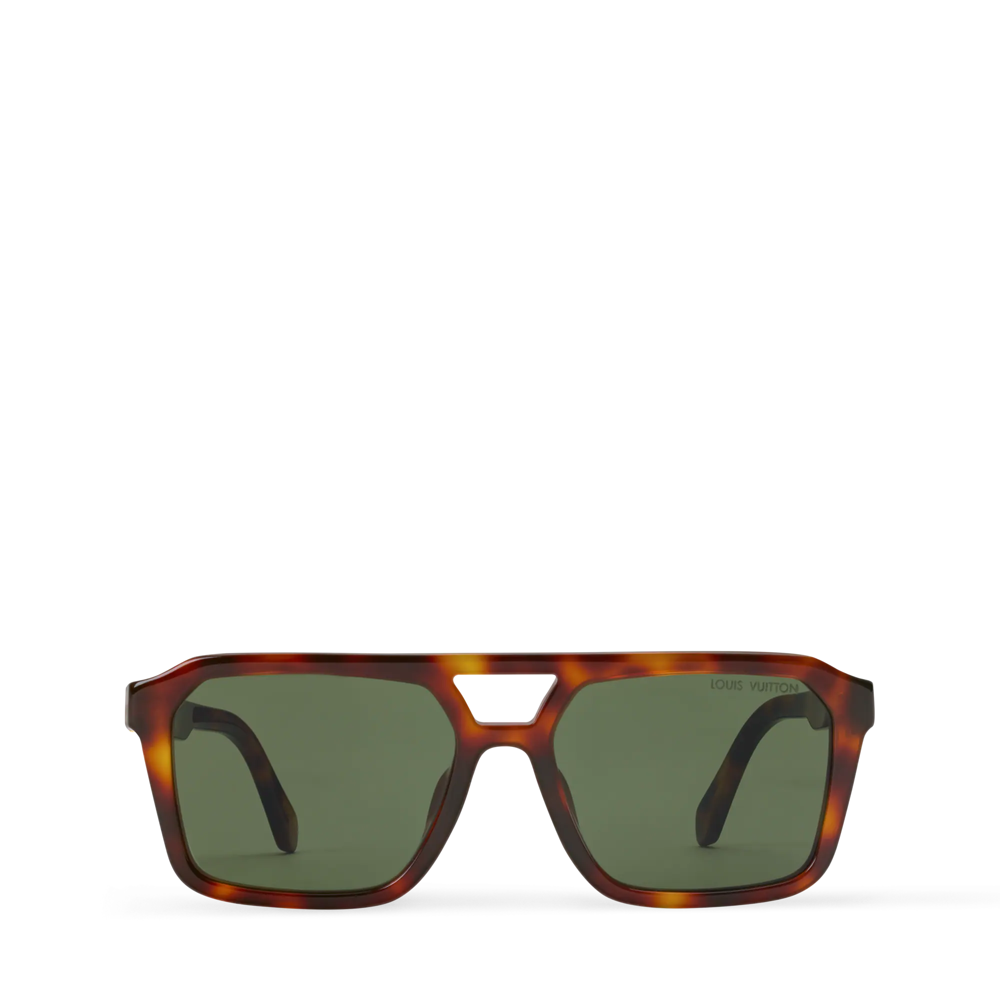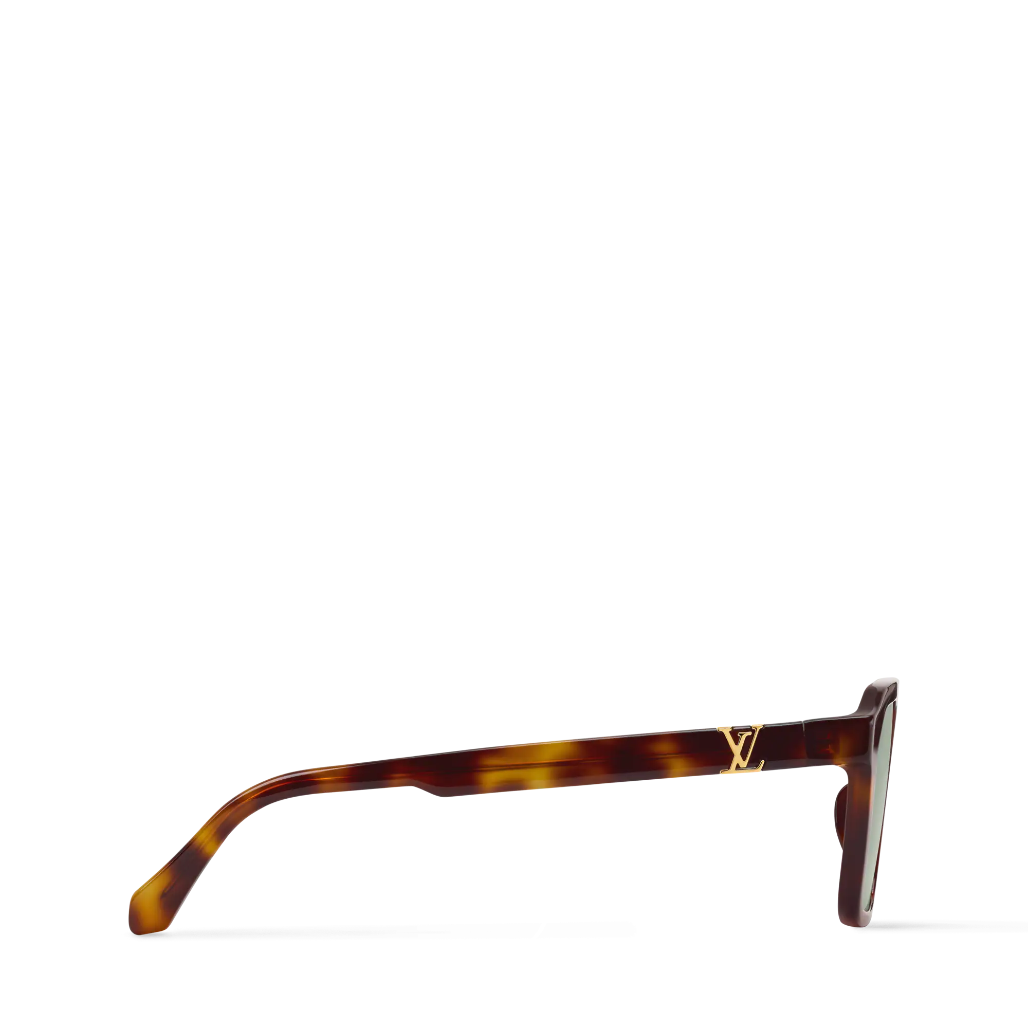 Four gold-tone metal stripes on the temples ending with LV initials enhance brand identity.