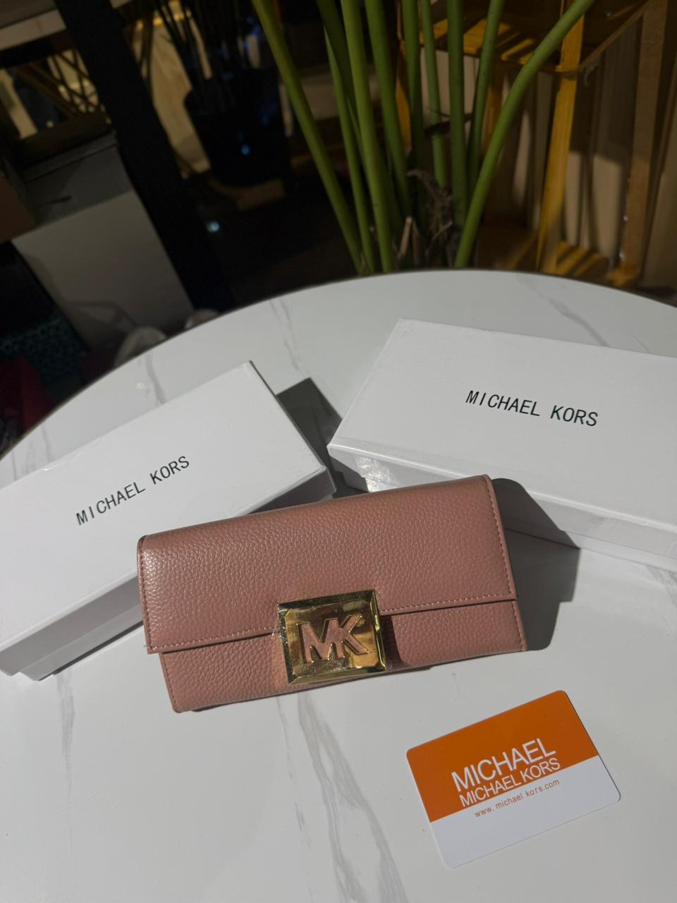 Crafted from premium leather or signature MK logo canvas, this wallet features a structured flap closure that keeps your essentials secure while maintaining a polished look. The iconic Michael Kors (MK) logo hardware on the front adds a signature designer finish, making it instantly recognizable.