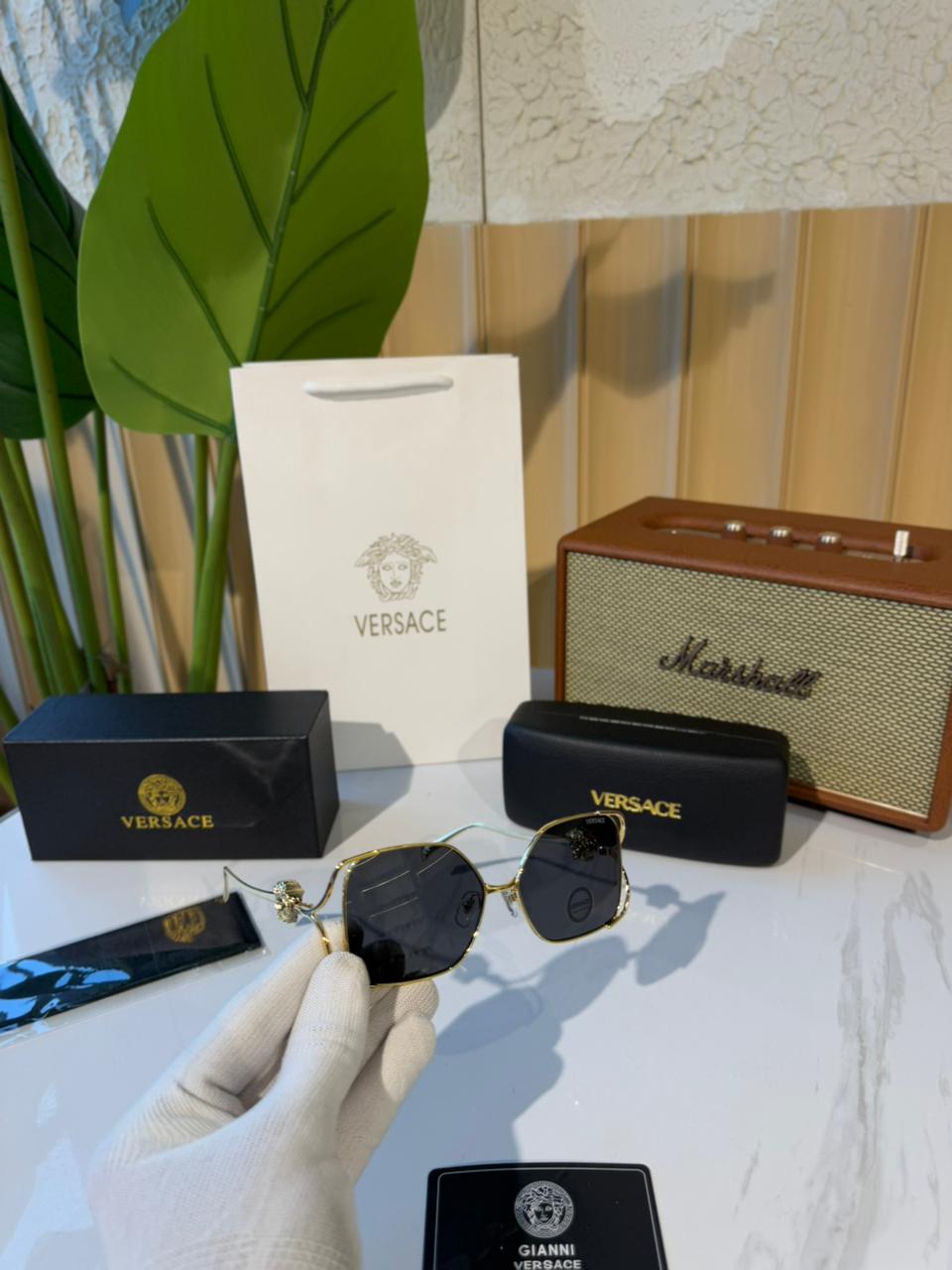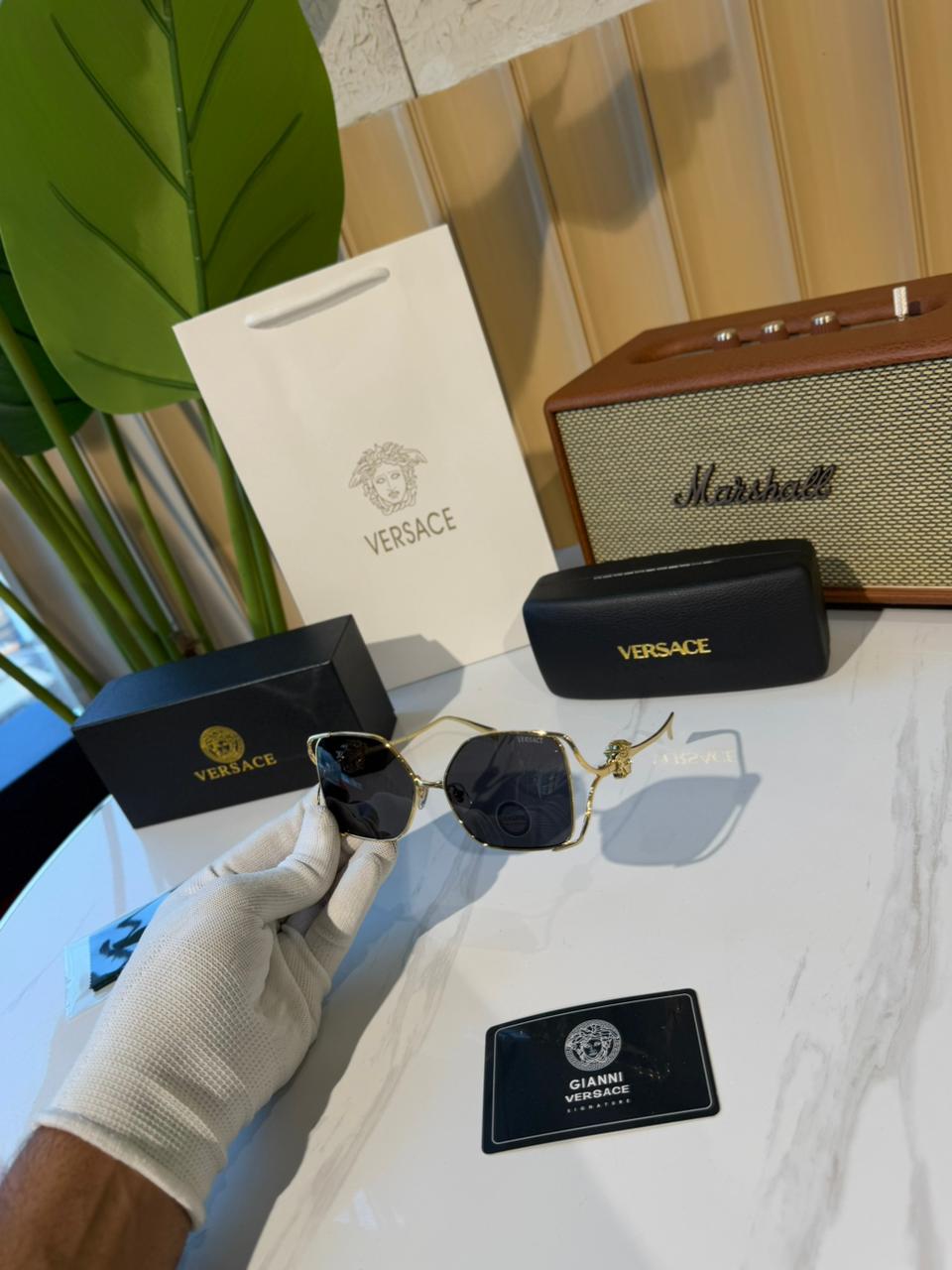 Luxury Versace oversized gold-frame sunglasses with dark grey UV-protected lenses and iconic Medusa accents.